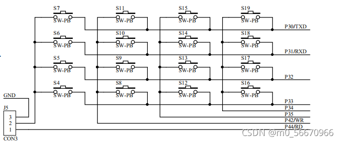 首先将J5的跳线帽1~2相连,与独立按键不同的是,矩阵按键的两个引脚都分别连接的单片机的I/O端口,一个作为行信号,另外一个作为列信号。