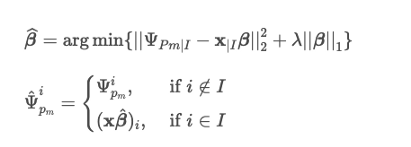 我们将中断信号的索引集标记为,表示从y中删除索引为I的剩余向量,和是相应的字典矩阵,通过删除I中所有索引的剩余列获得。现在,稀疏系数β可以通过以下公式计算: