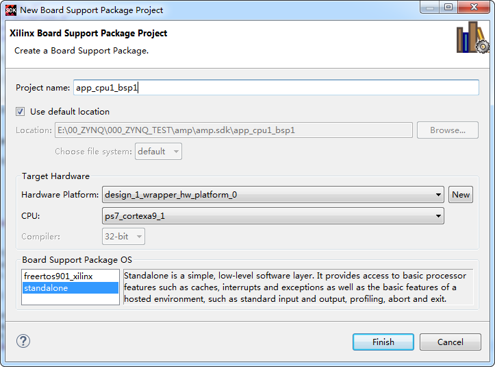 建立好板级开发包后,建立cpu1的sdk工程,该工程的配置与和0也有不同,就是在新建工程对话框的参数配置要与核0不同,其核心选择核心1,板级支持包选择刚刚建立的cpu1的板级支持包(proccessor:ps7_cortexa9_1;Borad Support Package:app_cpu1_bsp),建立好双核的应用工程和板级开发包后,进行软件的设计。