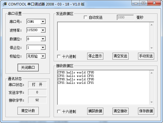 将上述程序生成boot.bin文件,然后下载到flash,启动后通过串口助手可以收到cpu0与cpu1的打印信息,每间隔两秒打印一次,如图3所示。