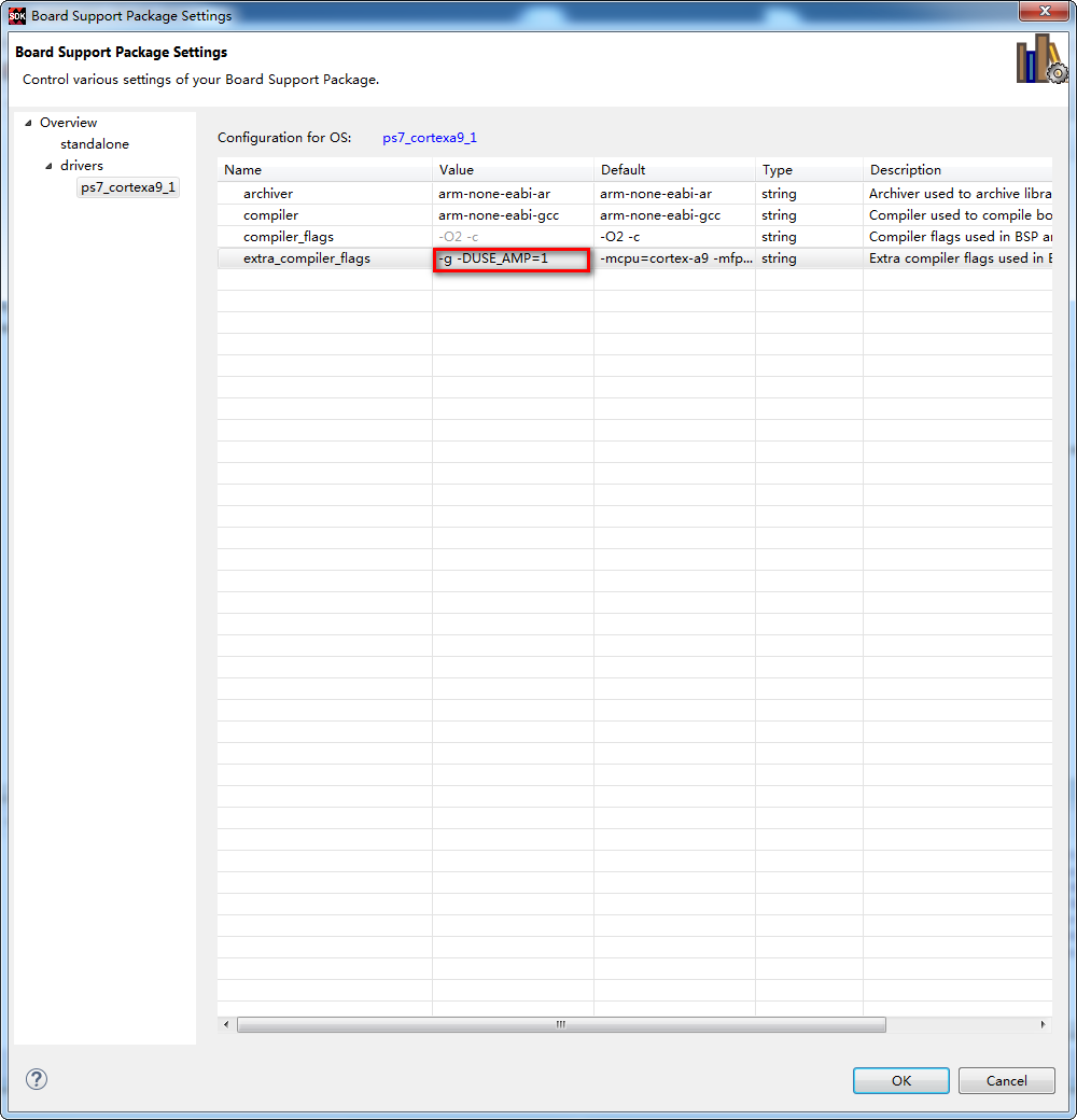 - 在右侧的Configuration for OS界面中,找到名字为extra_compiler_flags一行,将其对应的Value一列的值改为-g –DUSE_AMP_ = 1,如图2所示;