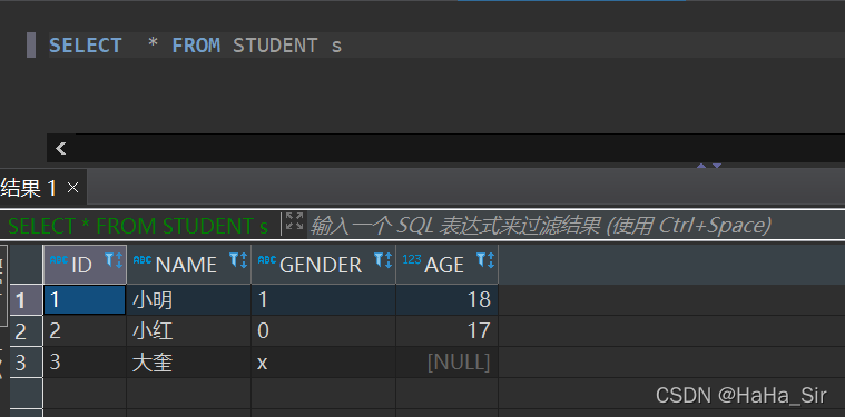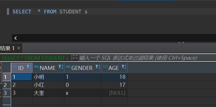 2、假设有一张表Student ,有4个字段, ID,NAME,GENDER,AGE ,分别是 编号,姓名,性别,年龄。数据内容如下: