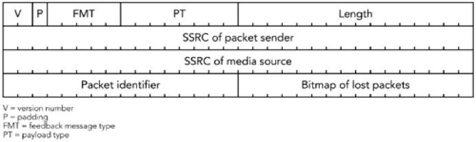 nack rtcp报文格式如上图所示,pt=205。Packet identifier(PID) 为丢包起始参考值,Bitmap of Lost Packets(BLP)为16位的bitmap,对应为1的为表示丢包数据,具体如下抓包分析: