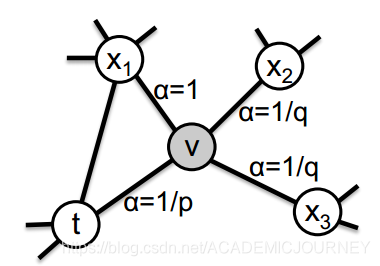 之间的最短路径,这里作者定义的取值范围为{0,1,2},这样作者定义的p和q就能有效的引导游走序列了。