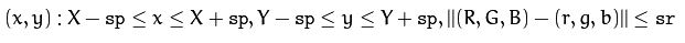 像素点(X,Y)的颜色值为(R,G,B), 它的空间邻域点(x,y)的颜色值为(r,g,b),如果点(x,y)的到(X,Y)的颜色距离小于sr,则满足条件,最终我们求得满足条件点的平均空间坐标(X’,Y’)以及平均颜色向量(R',G',B'),并把它们作为下一次迭代的输入。