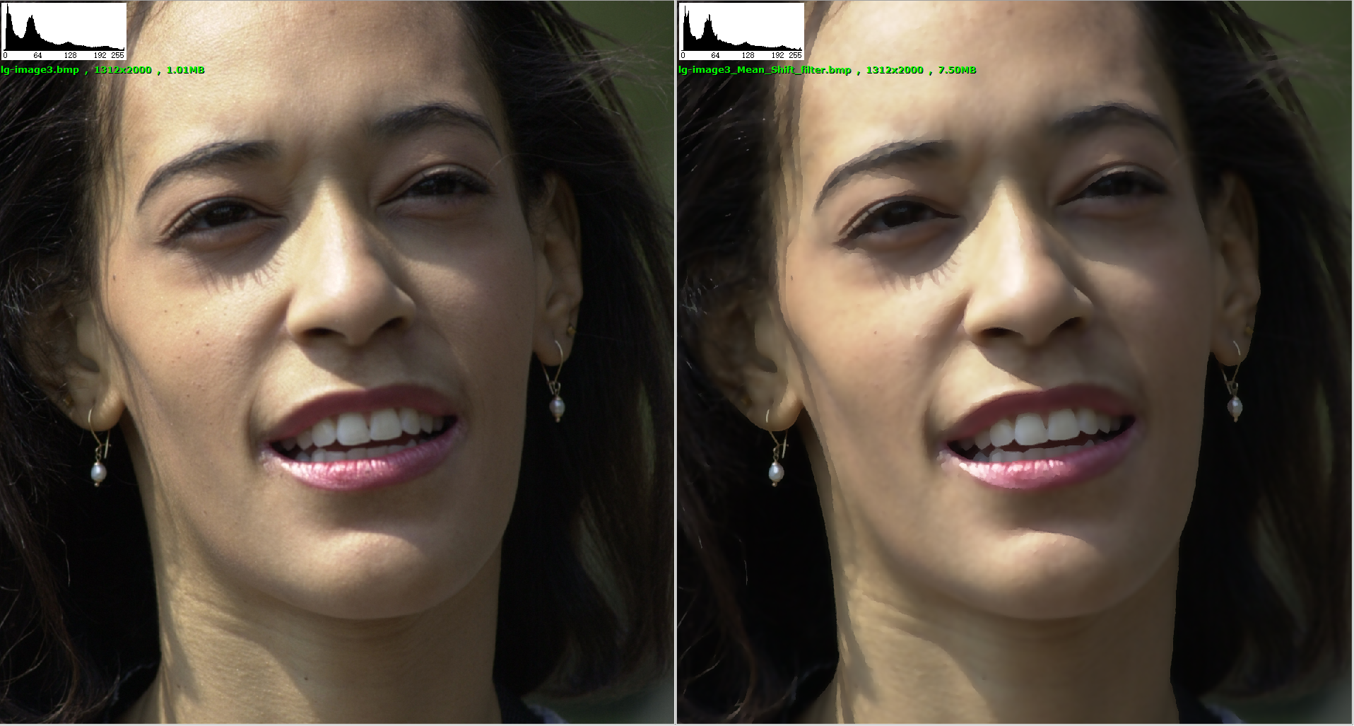 ///*/for(ry = - rad;ry <= rad;ry++){y2 = yc+ry;if(y2 >= 0 && y2 < img->height){for(rx = -rad;rx <= rad;rx++){x2 = xc+rx;if(x2 >= 0 && x2 < img->width){if(ry*ry+rx*rx <= rad*rad){Y2 = ((float*)(YIQ_img->imageData+y2*YIQ_img->widthStep))[x2*YIQ_img->nChannels+0];I2 = ((float*)(YIQ_img->imageData+y2*YIQ_img->widthStep))[x2*YIQ_img->nChannels+1];Q2 = ((float*)(YIQ_img->imageData+y2*YIQ_img->widthStep))[x2*YIQ_img->nChannels+2];dY = Yc-Y2;dI = Ic- I2;dQ = Qc- Q2;if(dY*dY + dI*dI+dQ*dQ <= colordis)//当前像素比周围邻域像素相差比较大的时候,在rad半径内(一个菱形领域),只有当前像素满足此条件,所以最后替换当前像素还是自己本身{mx += x2;my += y2;mY += Y2;mI += I2;mQ += Q2;num++;}}}}}}num_ = 1.0/num;Yc = mY*num_;Ic = mI*num_;Qc = mQ*num_;xc = (int)(mx*num_+0.5);yc = (int)(my*num_+0.5);dx = xc - xcOld;dy = yc -ycOld;dY = Yc - YcOld;dI = Ic- IcOld;dQ = Qc - QcOld;shift = dx*dx+dy*dy+dY*dY+dI*dI+dQ*dQ;iters++;}while(shift> 3 && iters < 100);R = CLIP((int)(Yc+0.9653*Ic+0.6210*Qc),0,255);G = CLIP((int)(Yc-0.2721*Ic-0.6473*Qc),0,255);B = CLIP((int)(Yc-1.1070*Ic+1.7046*Qc),0,255);((uchar*)(mean_shift_img->imageData+i*mean_shift_img->widthStep))[j*mean_shift_img->nChannels+0] = B;((uchar*)(mean_shift_img->imageData+i*mean_shift_img->widthStep))[j*mean_shift_img->nChannels+1] = G;((uchar*)(mean_shift_img->imageData+i*mean_shift_img->widthStep))[j*mean_shift_img->nChannels+2] = R; }}}
