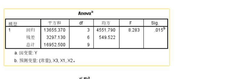 F的值是F检验的结果,他对应的P就是表格中的sig具有重要意义,表格中p=0.015<0.05表明支持原假设,也就是说线性回归方程显著,F检验就是判断回归方程是否显著的。对应的下面的T检验就是判断回归方程的各个变量是否显著的。(就是各个变量的重要程度)