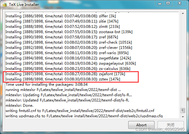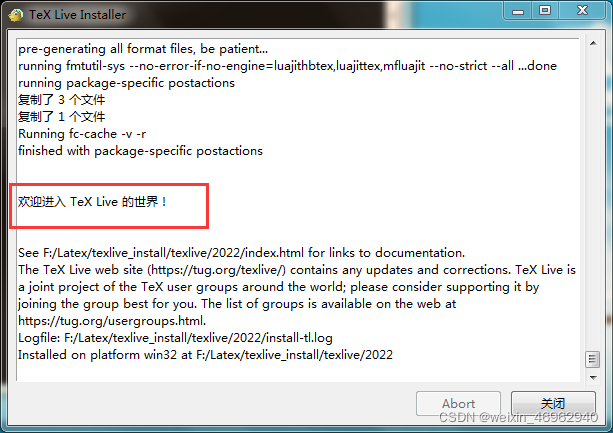 出现“欢迎进入 Tex Live 的世界!”则安装完成,点击关闭就可以了,用时约3h