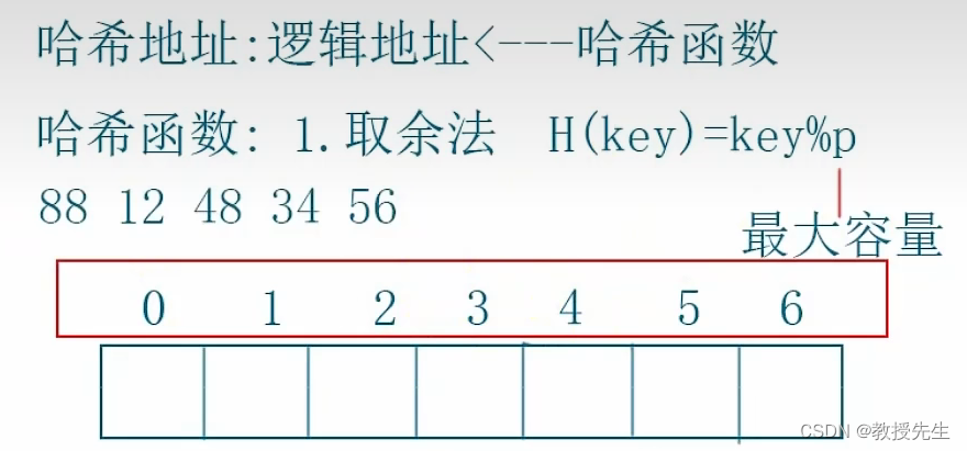 这里它的一定规律是 取余法 H(key)=key%p (还有其他方法,这里采用的是取余法),p为这个数组的最大容量,这里一共有7个数字,p就是7.取他们的余数依次按照从小到大的顺序依次排列到下方空数组(称为哈希表)中,