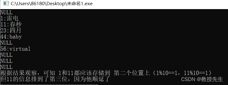 { //创建哈希表内存大小 LPHASH hash = createHashTable(10);DATA array[5] = { 1,"雷电",11,"春秒",23,"四月",44,"baby",56,"virtual" };//赋值传参 for (int i = 0;i < 5;i++){insertData(hash, array[i]);//调用插入函数,for循环5次插入 }printHash(hash);//调用打印函数,输出结果,判断 printf("根据结果观察,可知 1和11都应该存储到 第二个位置上(1%%10==1,11%%10==1)\n"); printf("但11的信息排到了第三位,因为他顺延了"); return 0;