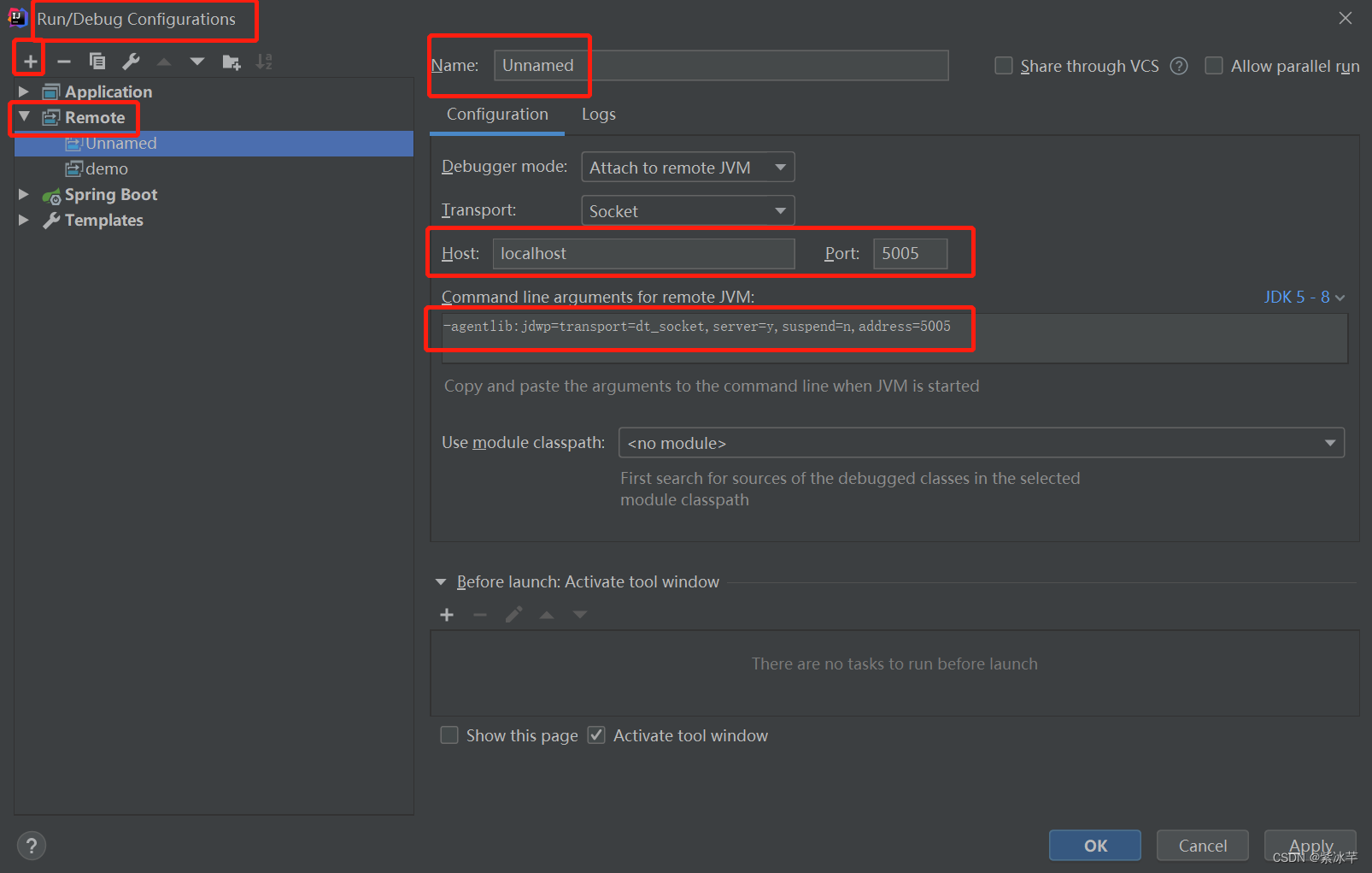- 在IDEA中,依次点击Edit Configuration->+->Remote,新建一个远程调试,其中Name随便起名字,Host是jar包目标运行位置(如果在本地可以写localhost),Port使用默认的5005即可,拷贝Command line arguments for remote JVM的内容;