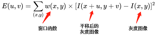 对于图像的每一个像素点(x,y),对应一个以该像素为中心的窗口w(x,y),然后该像素平移(u,v)得到新的像素点(x+u,y+v),而E(u,v)就是窗口中所有像素的加权和乘以不同位置像素的灰度差值。