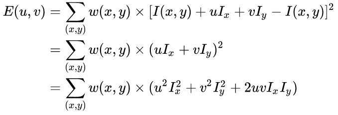 1、当窗口同时向 x 和 y 两个方向移动时,计算窗口内部的像素值变化量E(u,v);