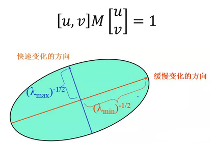 忽略余项之后的表达式为一个二项式函数,然而二项式函数的本质上就是一个椭圆函数,椭圆的扁率和尺寸是由M(x,y)的特征值λ1、λ2决定的,椭圆的方向是由M(x,y)的特征矢量决定的,如下图所示,椭圆方程为: