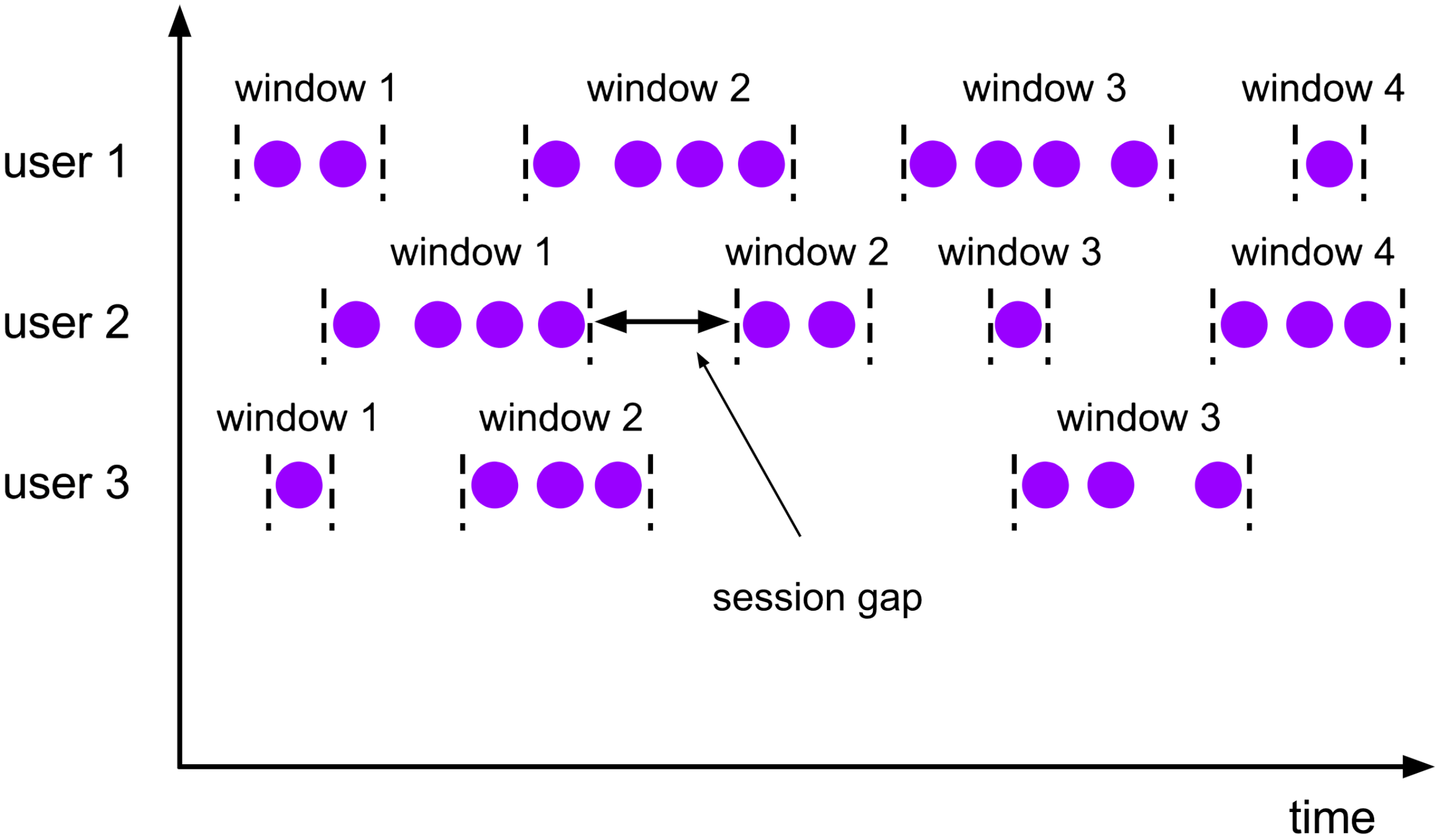 当登录网站或app时,操作记录总是在一段时间内,退出app后就没有数据了,这时候当我们需要分析用户在登录app期间的行为时,就可以用到session窗口。session窗口设定了一个最大空闲时长,超过这个时长即可认为用户已退出app,这个时候开始进行用户全程操作计算,这个一般使用的不多。