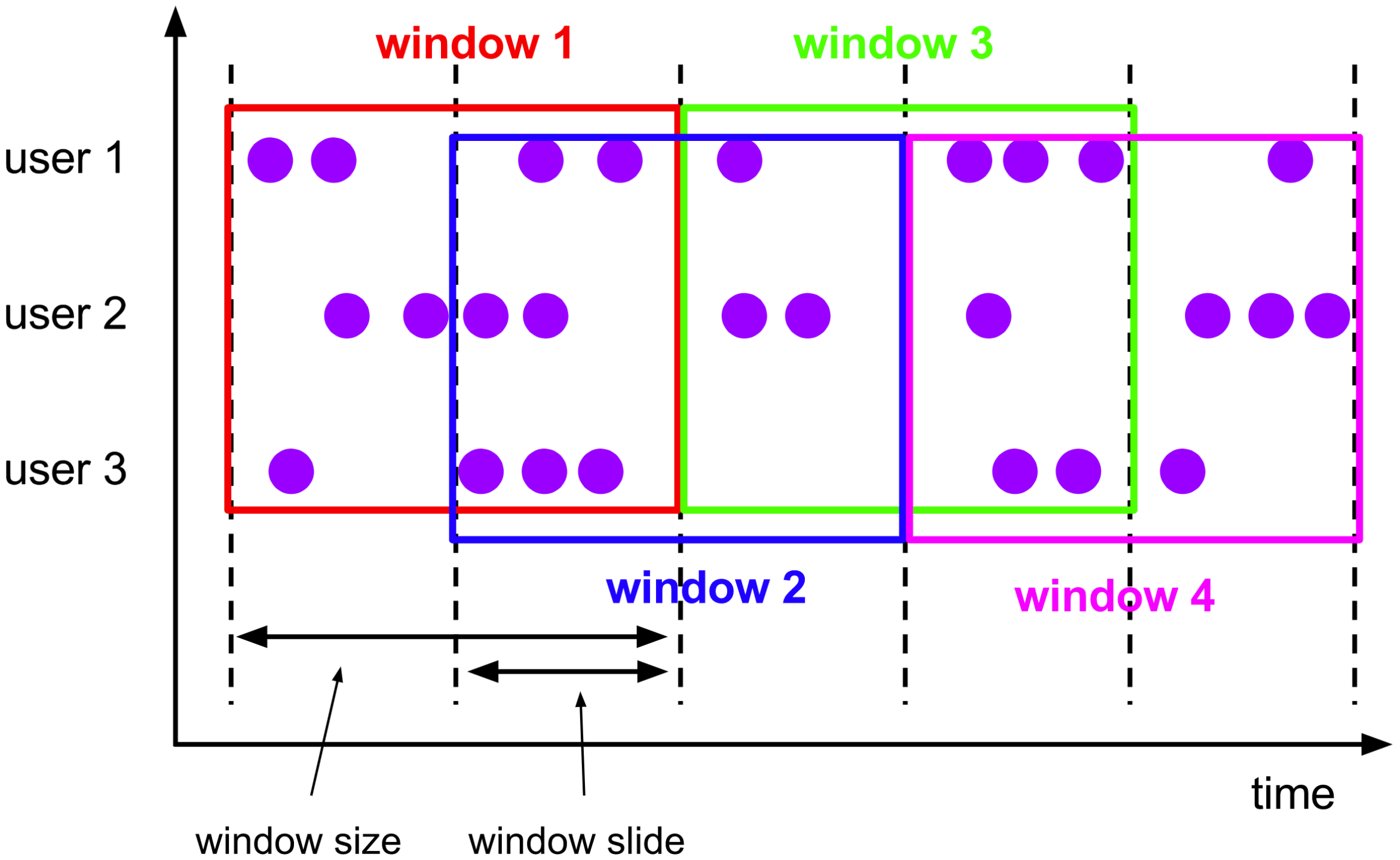 滑动窗口由两个时间概念组成,一个是窗口大小,一个是滑动步长。举个例子,比如我们需要每分钟看一下最近30分钟内的统计数据,现在是31分,那我们需要看到0到30分的数据;到了32分,我们需要看1分到31分这半个小时的数据,这就是滑动窗口。 滑动窗口每次根据步长进行向前滑动,但统计的数据是窗口长度内的数据。