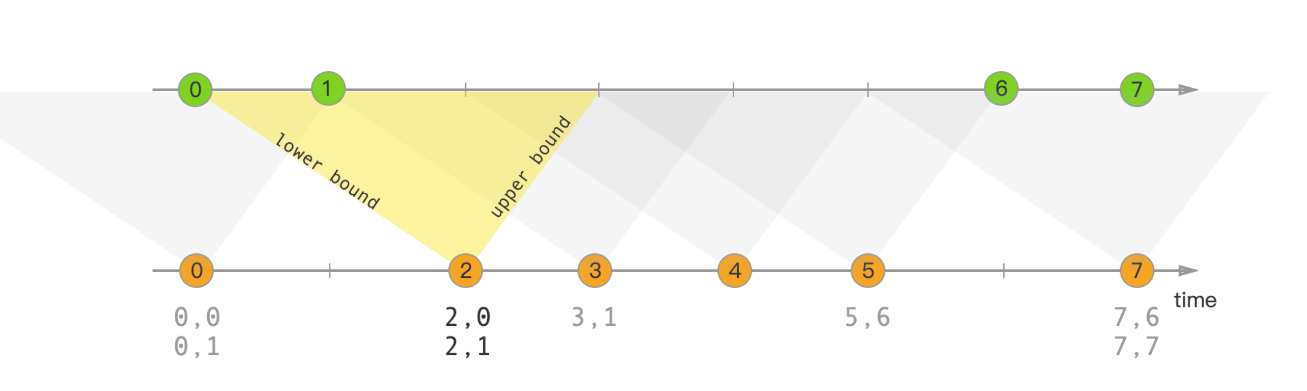 下图为区间关联示例,详细描述了区间关联的过期数据流程。两条线是两条数据流,下面是右流,上面是左流,区间关联的限定条件是左流的时间最小不小于右流数据减2分钟,最大为右流数据加1分钟,下图黄色区域,如果右流当前数据时间是2分,那左流最旧保存0分数据,最新能关联到3分数据,也就是0分到3分之间这部分黄色区域。同样,当上面的左流数据已经到3分的数据时,下面的右流能关联到的数据区间是2分到5分之间。这样的话依照下面右流的数据,可以对上面左流晚于窗口期的数据进行过期清理,而下面右流的数据也可以根据上面左流数据的时间进行过期处理,最终Flink状态里只保存着有限、少量的数据,既保证了数据关联的完整性又减少了内存占用,任务始终以轻量化状态运行,保持高效数据计算。