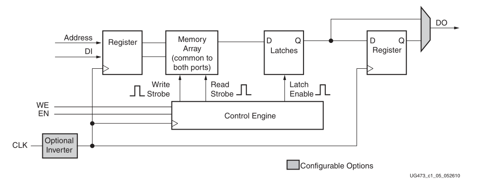 在做读操作的时候,BRAM和DRAM不同。DRAM是组合逻辑直接输出,BRAM则是时序逻辑输出。我们看一下BRAM(图1)的结构就可以知道为啥。因为我们DRAM把地址送进去的时候是不需要时钟的(地址作为LUT输入,数据作为LUT输出,中间无寄存)。然而BRAM把地址送进去的时候是要过寄存器滴,所以数据也是要有时钟才能输出。此外BRAM的输出还内嵌了个寄存器,我们打拍输出的时候可以使用它,这样就能省下SLICE上的寄存器资源。