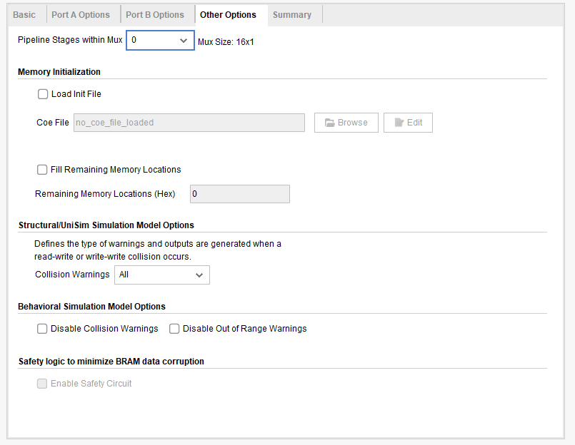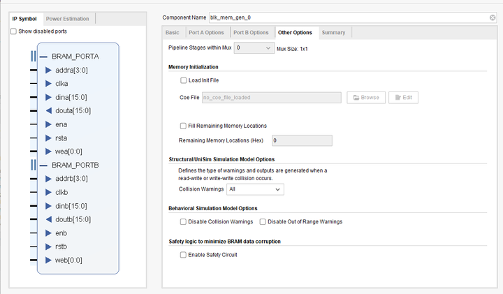 Structual/UniSim Simulation Model Options,用于仿真时,对读写冲突、写写冲突的告警(注:读写冲突即PORTA PORTB在同一时刻对同一地址做一读一写操作,写写冲突即PORTA PORTB在同一时刻对同一地址做写操作)