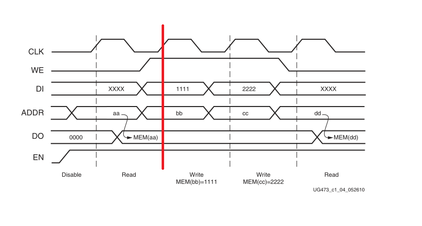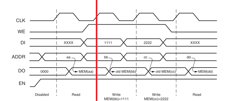 READ_FIRST的时序图,在红线以前,WE=0 ,即端口做的是读操作。在CLK上升沿后,地址aa里的数据打到DO。在红线后,WE=1,即端口做的是写操作。在CLK上升沿后,DI的数据存入到地址bb里,与此同时原先存放在地址bb的数据输出到DO。就像处了一段时间,新男/女朋友替换掉前男/女朋友。这就是READ_FIRST的特性。