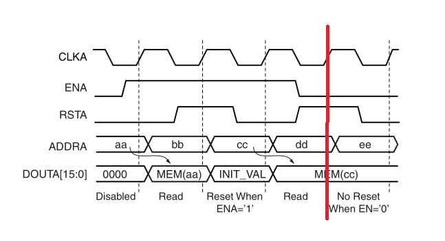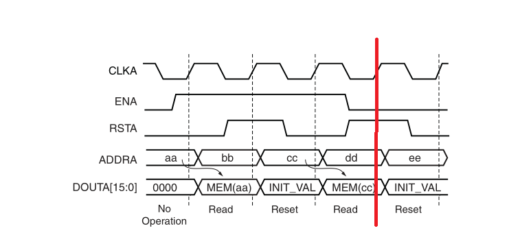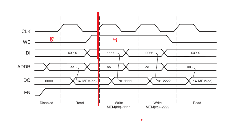 WRITE_FIRST的时序图,在红线以前,WE=0 ,即端口做的是读操作。在CLK上升沿后,地址aa里的数据打到DO。在红线后,WE=1,即端口做的是写操作。在CLK上升沿后,DI的数据存入到地址bb里,与此同时输入的数据DI直接打到去输出DO,(⊙﹏⊙)原先存在bb里的数据嘛还没出来就被冲掉。就像老实人还没表白就被渣男抢占了,这就是WRITE_FIRST的特性。