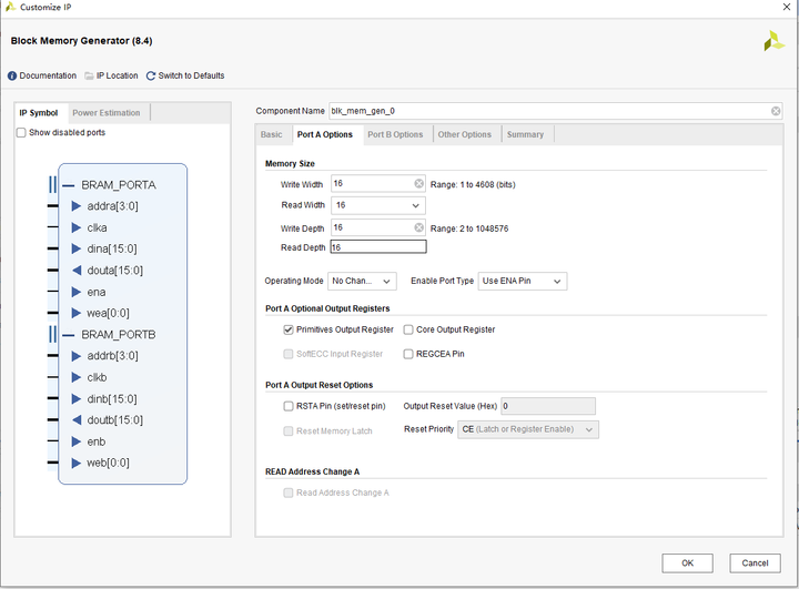 Algorithm Options 。这个算法选项主要用于决定BRAM的拼接的方式,一般在BRAM深度、宽度较大的时候起作用(准确来讲是1个18K BRAM或者1个36K BRAM无法满足BRAM所需存储大小的时候)。它有三个选项,1.Minimum Area(小面积)。2.低功耗(Lower Power)。3.(Fixed Primitives)固定原语,可选16kx1,8kx2等。前两个看名字就知道是啥意思,第3个的话就是用固定原语的方式来生成你想要的BRAM,这个主要是在不同器件间工程移植用的比较多,例如你在XILINX 移植到ALTERA或者LATTICE的器件,它们单个BRAM 的原语都是类似的。如果要在多平台对工程/IP进行移植,用这个选项的话修改的东西会比较少。