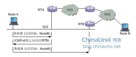 (2)RTA向始发报文的NodeA发送一个ICMPv6重定向报文,目标地址中含有RTB的IPv6地址,报文选项字段的目标链路层地址中含有RTB的链路层地址。