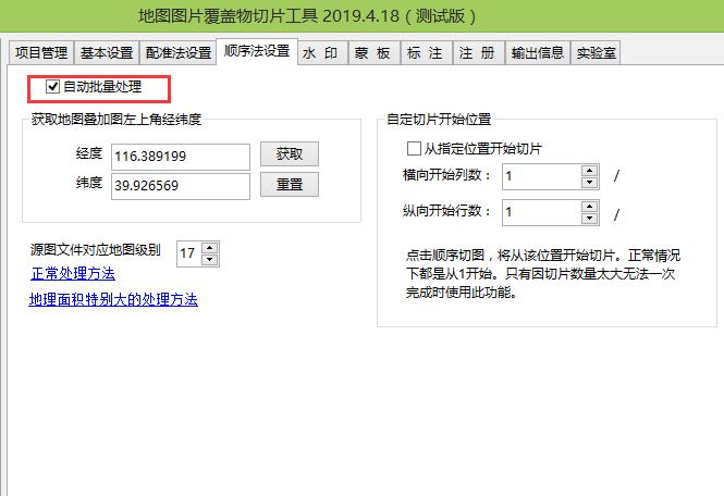 4、选中批量复选框。按照普通顺序法方法,定义好1.png文件的左上角经纬度及其他参数。