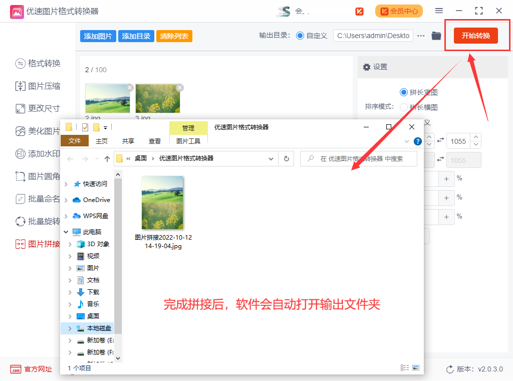 第4,点击软件上的【开始转换】红色按钮,启动软件程序,稍微等待一会,当软件弹出输出文件夹时说明图片合并完成,可以看到合成的图片就保存在这里。