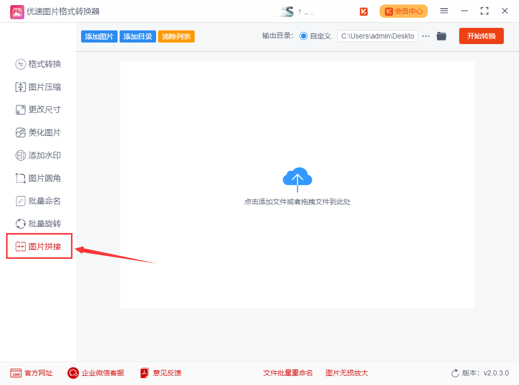 先打开电脑上已经安装好了的“优速图片格式转换器”软件工具,可以界面的左边是功能菜单,点击我们今天要使用的【图片拼接】功能选项。