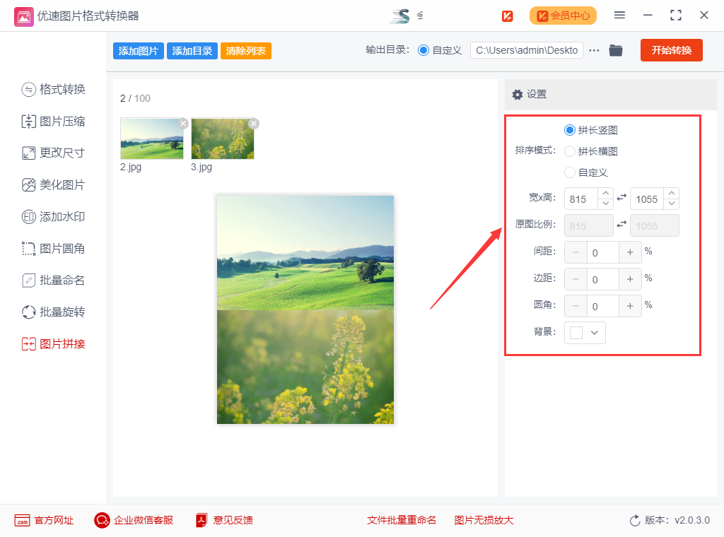 因为要上下合成,所以排序模式选择“拼长竖图”;然后再设置合并后图片的宽和高、间距、边距、圆角、背景颜色等参数。