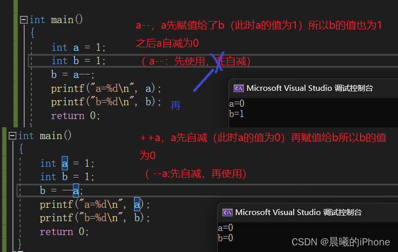 注:a--与--a的区别是:前者是先使用,再自减,后者是先自减,再使用。例如: