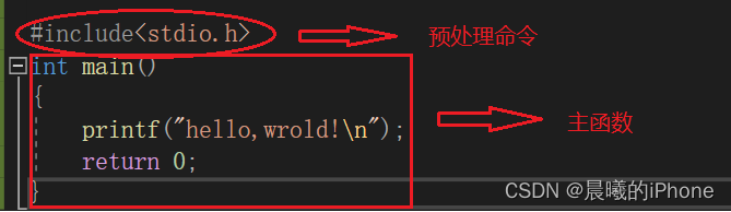 - 而因为使用了printf所以要引用头文件#include<stdio.h>(printf是c语言标准库函数,定义与头文件<stdio.h>)