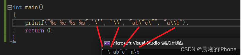 - 第一个字符串常量是"ab\"c\"",它包含两个双引号“"”,在字符串中用转义字符表示