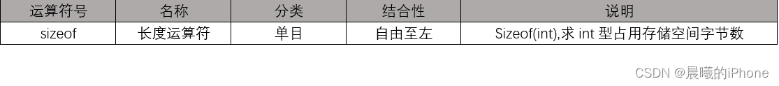 运算符sizeof是求某一操作对象占用的内存字节数,其运算结果为整型数据 如下表: