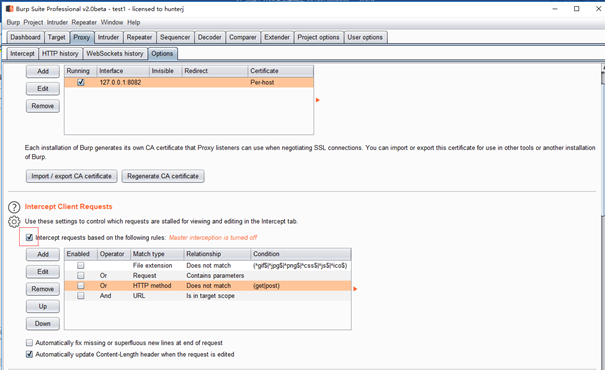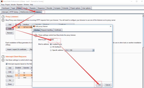 BurpSuite设置监听地址(监听的端口不能与系统已有服务相冲突,该端口与浏览器代理端口要一样)