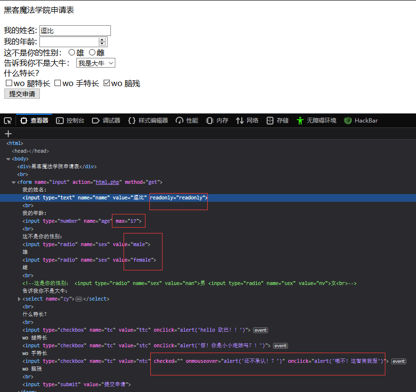 通过html源码可以看出,表单字段被限制(字段限制,其实可以通过直接修改html即可通过,但由于这个表单需要配合修改头部字段,所以直接采用修改数据包)