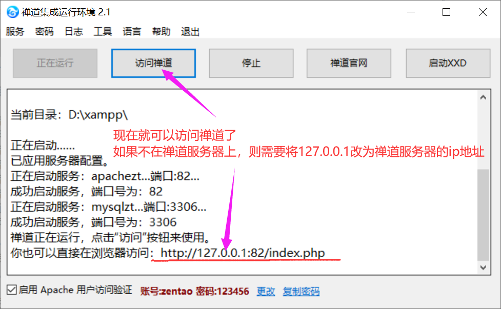 3)启动成功后,就可以通过点击 【访问禅道】或者 输入网址访问禅道了
