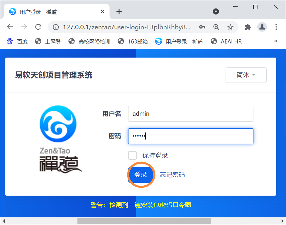 需要注意的是,如果要在其他计算机上访问,请将127.0.0.1改为禅道服务器的ip地址奥