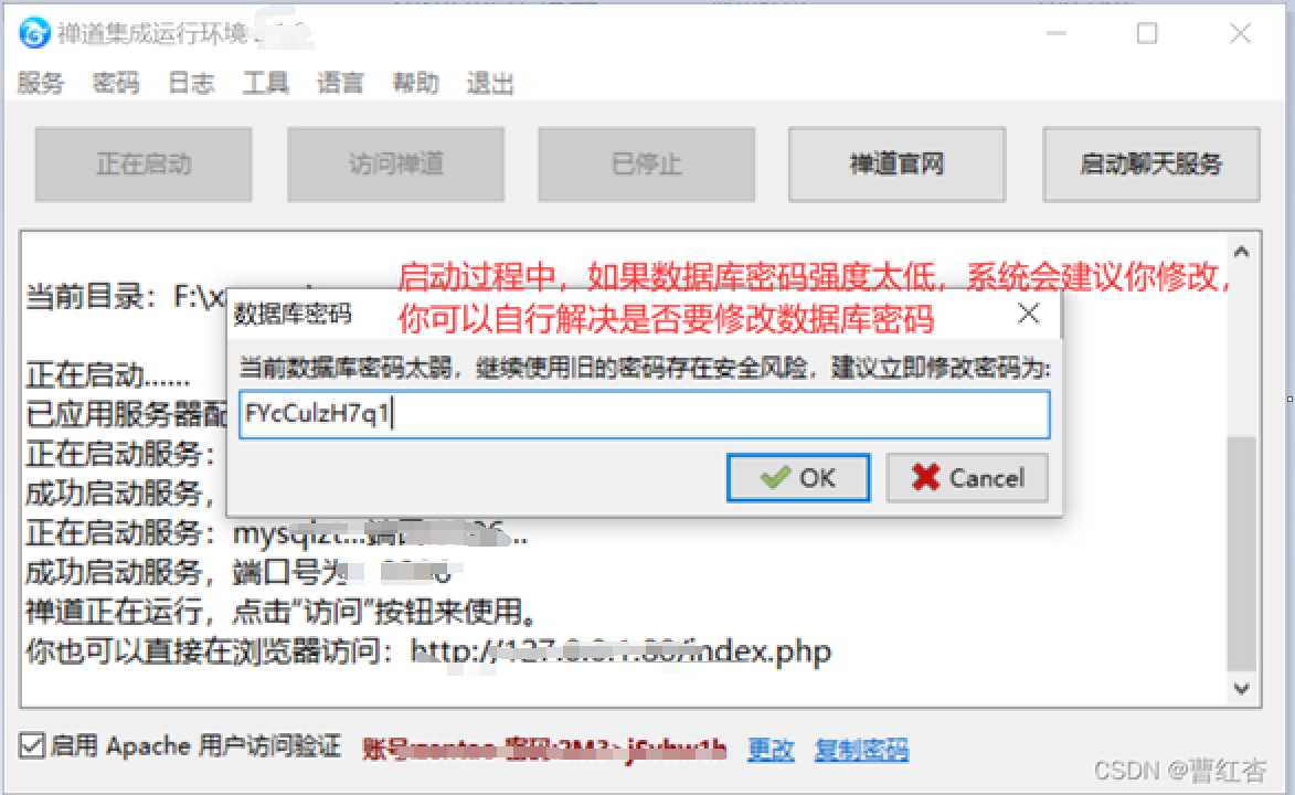 根据实际情况确定数据库密码是否更新后,关闭数据库密提示框,系统启动禅道服务。