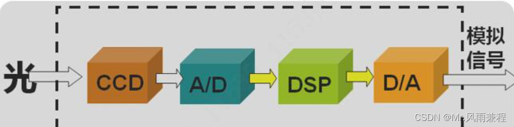在模拟摄像机中,图像传感器(CCD或CMOS)所产生的模拟信号首先经过模/数(A/D)转换器转换为数字信号,然后由摄像机内置的DSP芯片进行信号处理,如增益、降噪、背光补偿等处理。经过DSP处理后的数字信号又经过数/模(D/A)转换重新转化为模拟信号,用于在同轴电缆上进行传输,然后传输至DVR或DVS后再次进行模/数(A/D)转换来完成编码压缩工作,这样多次的模/数、数/模转换过程大大牺牲了图像质量。