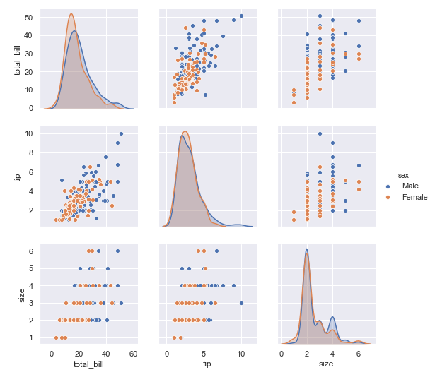 在顾客数量和小费的数目关系上, 我们可以发现, 同样的顾客数量, 男性要比女性给得小费更多