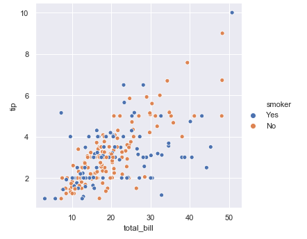 sns.relplot(x="total_bill", y="tip", hue="smoker", data=tips)# 利用hue 进行区分