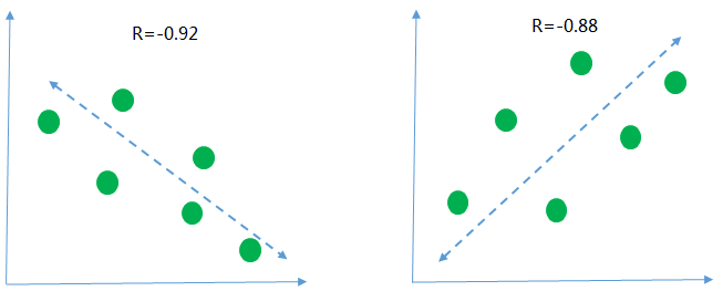 第一张图r=-0.92 <0 是说明横轴和纵轴的数据呈现负相关, 意思就是随着横轴的数据值越来越大纵轴的数据的值呈现下降的趋势, 从r的绝对值为0.92>0.8 来看, 说明两组数据的相关性高度相关