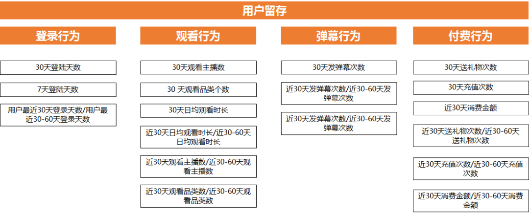 首先规划好完整的思路, 哪些行为和留存相关, 然后利用这些行为+时间维度 组成指标, 因为不同的时间跨度组合出来的指标, 意义是不一样的, 比如登录行为就有 7天登录天数, 30天登录天数