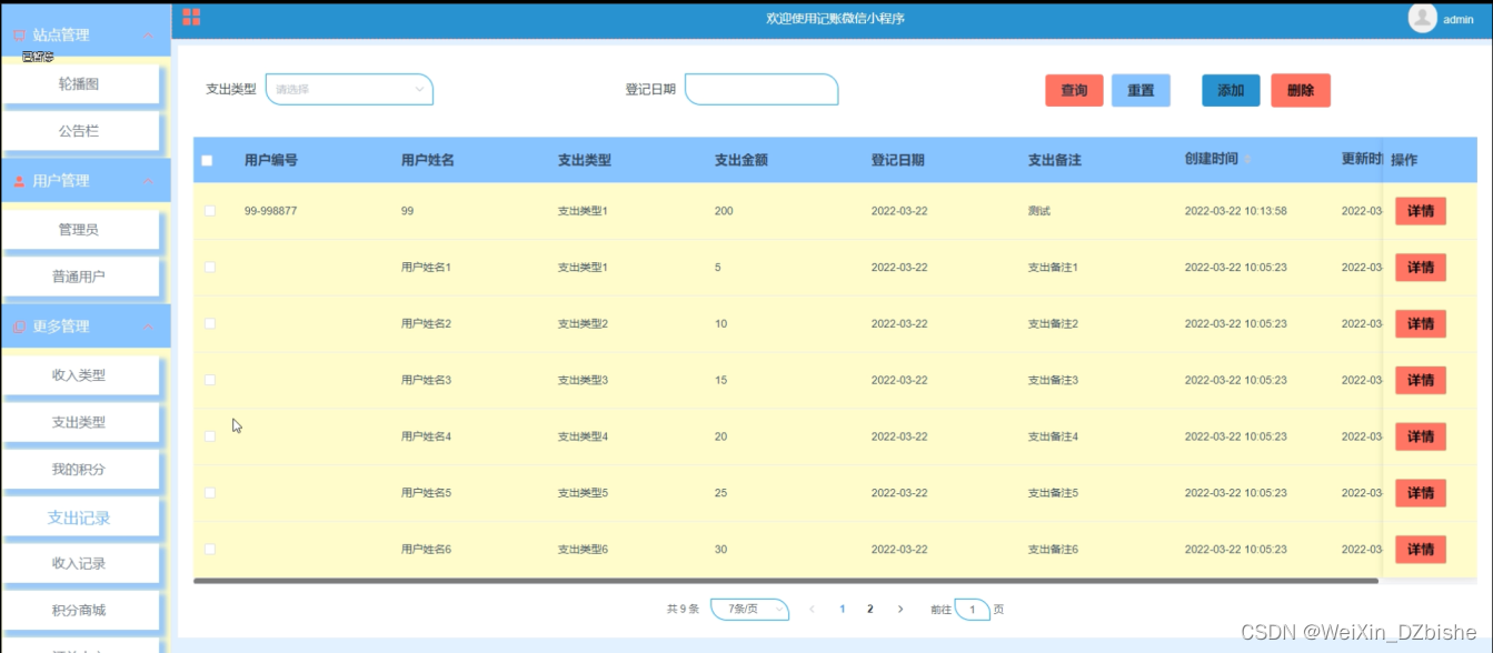 支出记录管理,在支出记录管理页面查看用户编号、用户姓名、支出类型、支出金额、登记日期、支出备注等信息,并可根据需要进行查看详情、修改或删除操作,如图5-13所示。