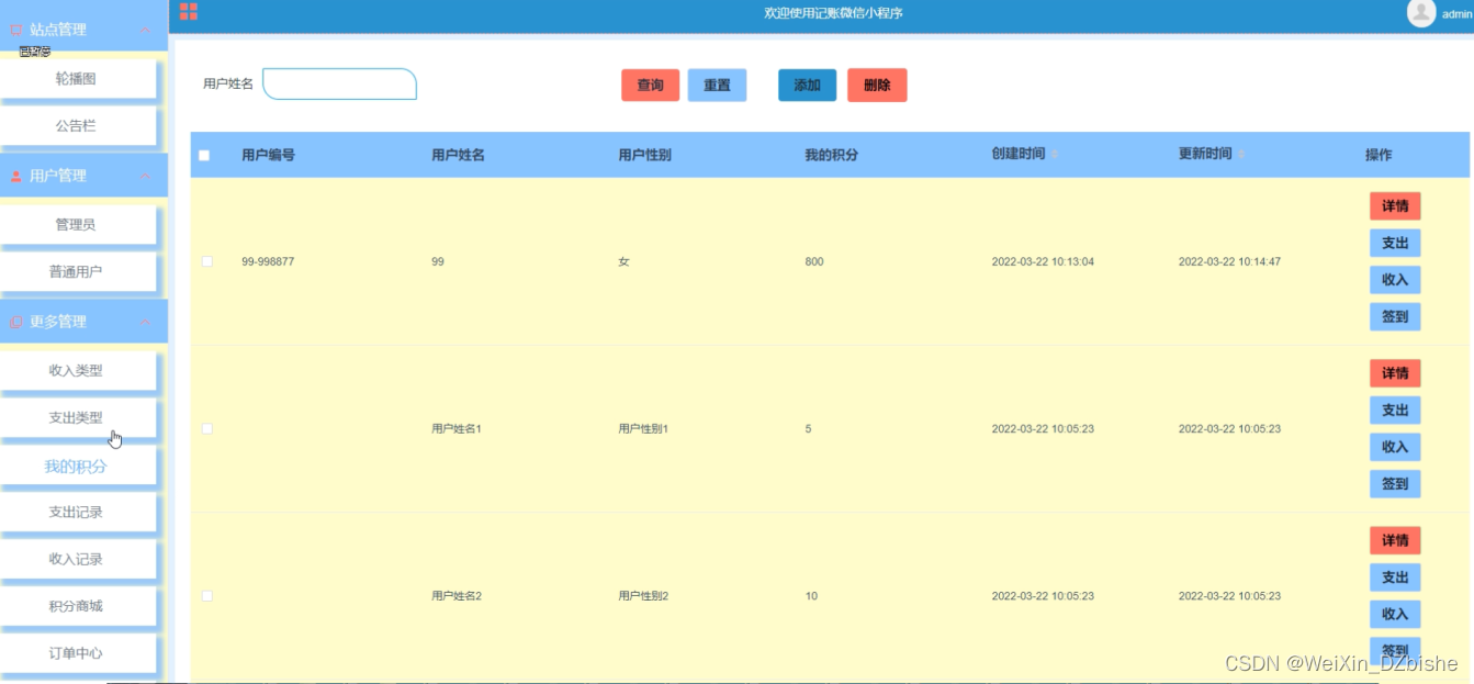 我的积分管理,在我的积分管理页面查看用户编号、用户姓名、用户性别、我的积分等信息,并可根据需要进行查看支出、收入、签到、修改或删除操作,如图5-12所示。