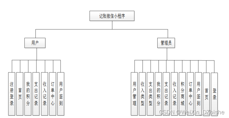(3)确定好系统使用的技术,进行在线确认系统所划分的用户角色,并且根据用户角色划分确定所要设计的功能模块,对于记账微信小程序系统的设计主要划分别为管理员和用户角色,并所使用的功能模块也相应不同,但是系统的数据库实现的内容是交互的,用户可以随时根据自己的需求进行查看,对于系统工作人员可以根据自己的分管内容进行在线信息的处理及操作,管理员获取到所有用户的详细数据信息,并根据需求进行第一时间处理解决。