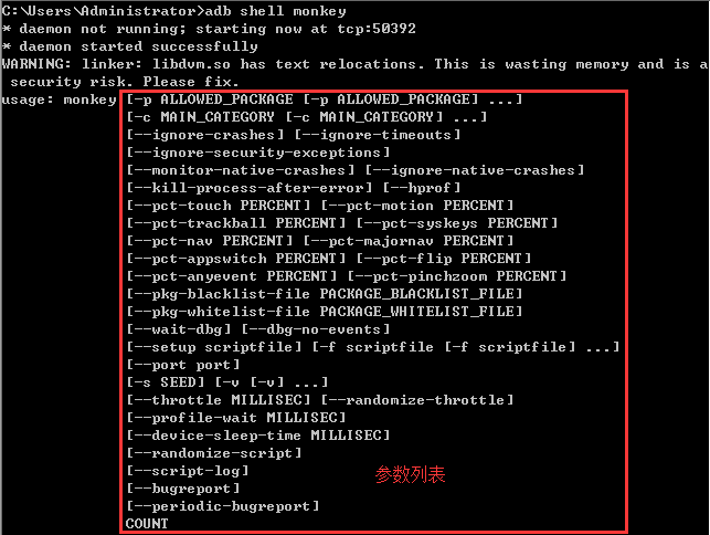 其中adb shell monkey 表示完成对安卓系统中命令的调用;