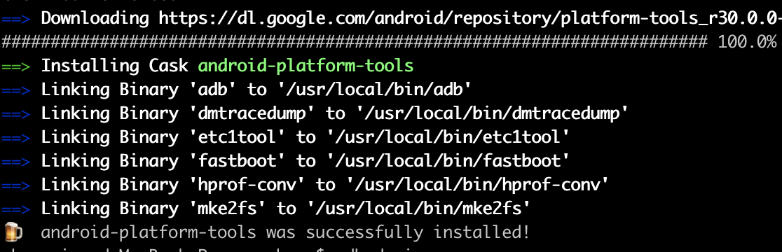 1)执行命令:brew install android-platform-tools ,安装工具包,该工具包中包含工具adb
